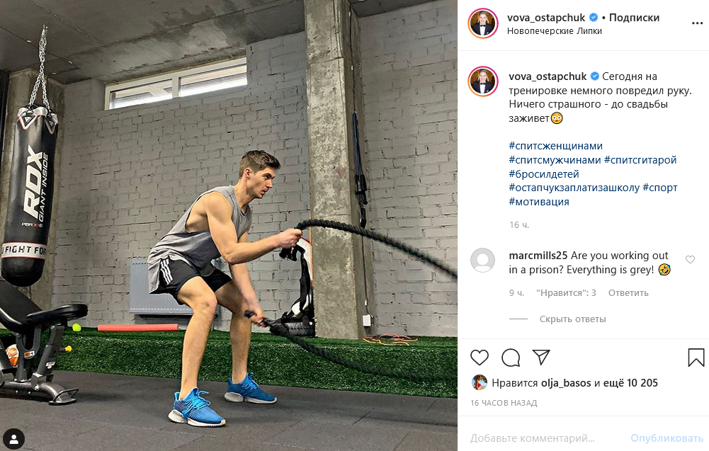 В своем посте телеведущий сообщил поклонникам, что получил травму, а также не упустил возможности в очередной раз высмеять слова бывшей возлюбленной. "Сегодня на тренировке немного повредил руку. Ничего страшного - до свадьбы заживет", - написал Остапчук, добавив хэштеги #спитсженщинами #спитсмужчинами #бросилдетей #остапчукзаплатизашколу.