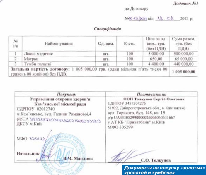 Согласно договору мэрия приобрела у бизнесмена 100 кроватей по цене 6 тысяч гривен за штуку (всего на 600 тыс. грн) и 100 тумбочек по цене 5 тыс. 280 грн за штуку (всего на 528 тыс. грн). При этом, никаких требований к их качеству, размерам и другим параметрам горсовет в договоре не указал. Более того, этот успешный предприниматель, который получает от мэрии миллионные заказы, к мебели, как и к упомянутым выше дезинфицирующим средствам, не имеет никакого отношения. Его профиль – оптовая торговля в самом широком смысле.