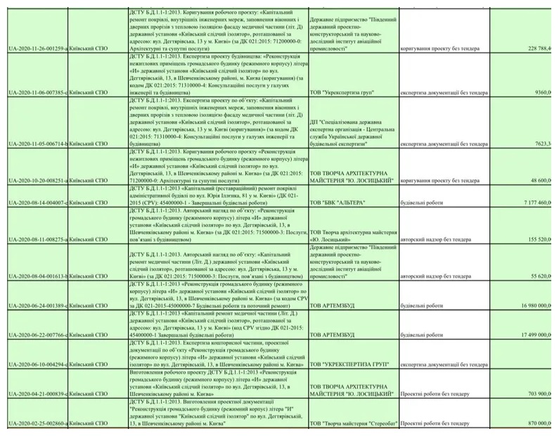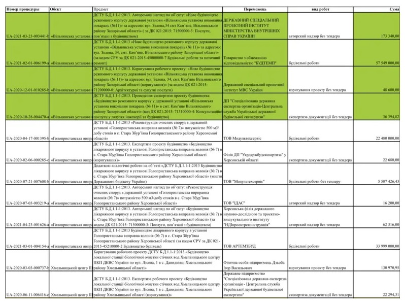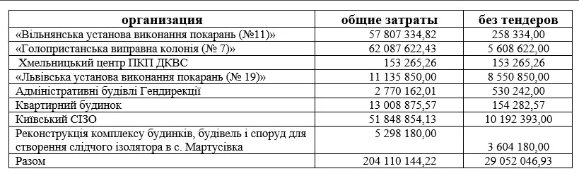 Причем, в двух случаях Гендирекция ДКВС просто перешла все рамки, потому что стоимость дополнительного (безтендерного) договора в несколько раз больше основного! Так, тендер на разработку эскизного проекта реконструкции "Львівської установи виконання покарань (№ 19)" обошелся бюджету в 2,55 миллиона гривен, а после Гендирекция ДКВС заключила уже без тендера дополнительный договор на сумму еще 8,55 миллиона гривен (все данные взяты из системы "Прозорро", которая публикует не только тендеры, а и договора). Такая же "смелая" схема использовалась при реконструкции Киевского СИЗО, где с помощью дополнительных договоров в обход тендеров провели более 10 миллионов гривен! (Смотрите Таблицы выше. - Прим. автора).