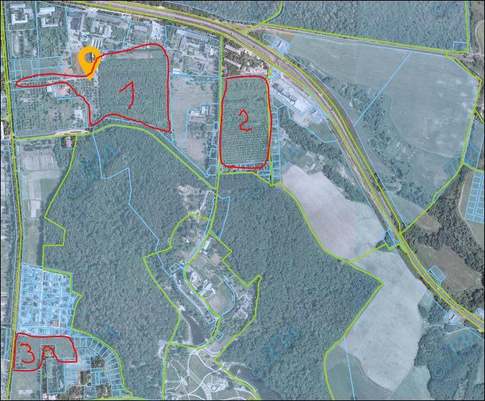 Амбициозный проект разделен на три участка, которые вообще-то являются частями одного проекта. Это более 14 гектаров на улице Академика Заболотного. Еще 7,7 га на улице Академика Лебедева. И более 2,5 гектаров на улице Метрологической. То есть в целом имеем почти 25 гектаров территории в лесу (это хорошо видно на карте), на которых хотят построить многоэтажные жилые кварталы, торговые и развлекательные площади.