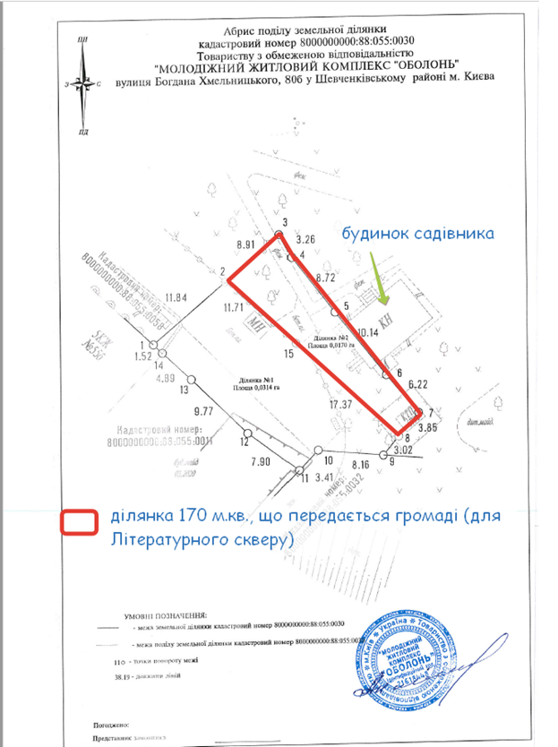 - Еще до того, как строительство перешло в ООО "Дилайвест", один из арендных участков 8000000000:88:055:0030 (площадью 0,0484 га) частично накладывался на границы сквера. Конечно, люди были совершенно правы, выступив с категорическим несогласием, чтобы от сквера была отрезана часть. Чтобы исправить ситуацию, мы запустили процедуру разделения граничащего со сквером участка на два отдельных. Одна из них – площадью 0,0170 га – присоединяется к скверу. Именно этот вопрос сейчас рассматривается на сессии КМР – передача земельного участка городу с последующим оформлением для нужд сквера. Еще раз подчеркиваю – ни один сантиметр сквера не будет отобран у общины.