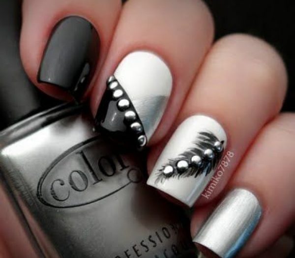 Для более неформального образа можно выбрать самоклеющиеся железные бусинки и различные яркие узоры. Например, хорошо в черно-белом маникюре выглядят нарисованные перья.