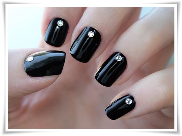 Еще одна простая идея для монохромного маникюра - стразы. Просто накрасьте ногти черным или белым лаком, нанесите по капельке специального клея на каждый ноготь и приклейте блестящие камушки или другие подобные украшения на ваш вкус.