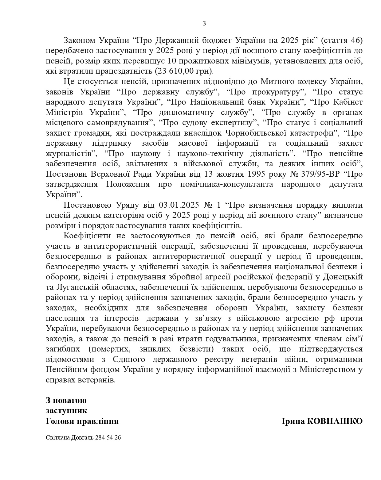 "Законом Украины "О государственном бюджете Украины на 2025 год" (статья 46) предусмотрено применение в 2025 году в период действия военного положения коэффициентов к пенсиям, размер которых превышает 10 прожиточных минимумов, установленных для лиц, которые утратили трудоспособность (23 610 гривен)", - ответили на это в Пенсионном фонде.