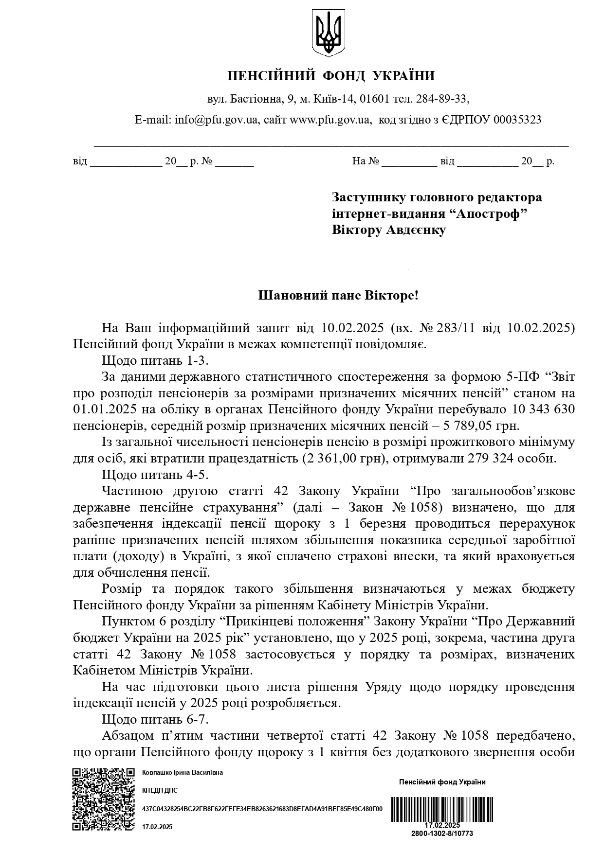"… по состоянию на 01.01.2025, на учете в органах Пенсионного фонда Украины состояло 10 343 630 пенсионеров, средний размер назначенных месячных пенсий - 5789,05 гривны", - говорится в ответе Пенсионного фонда на официальный запрос "Апострофа".