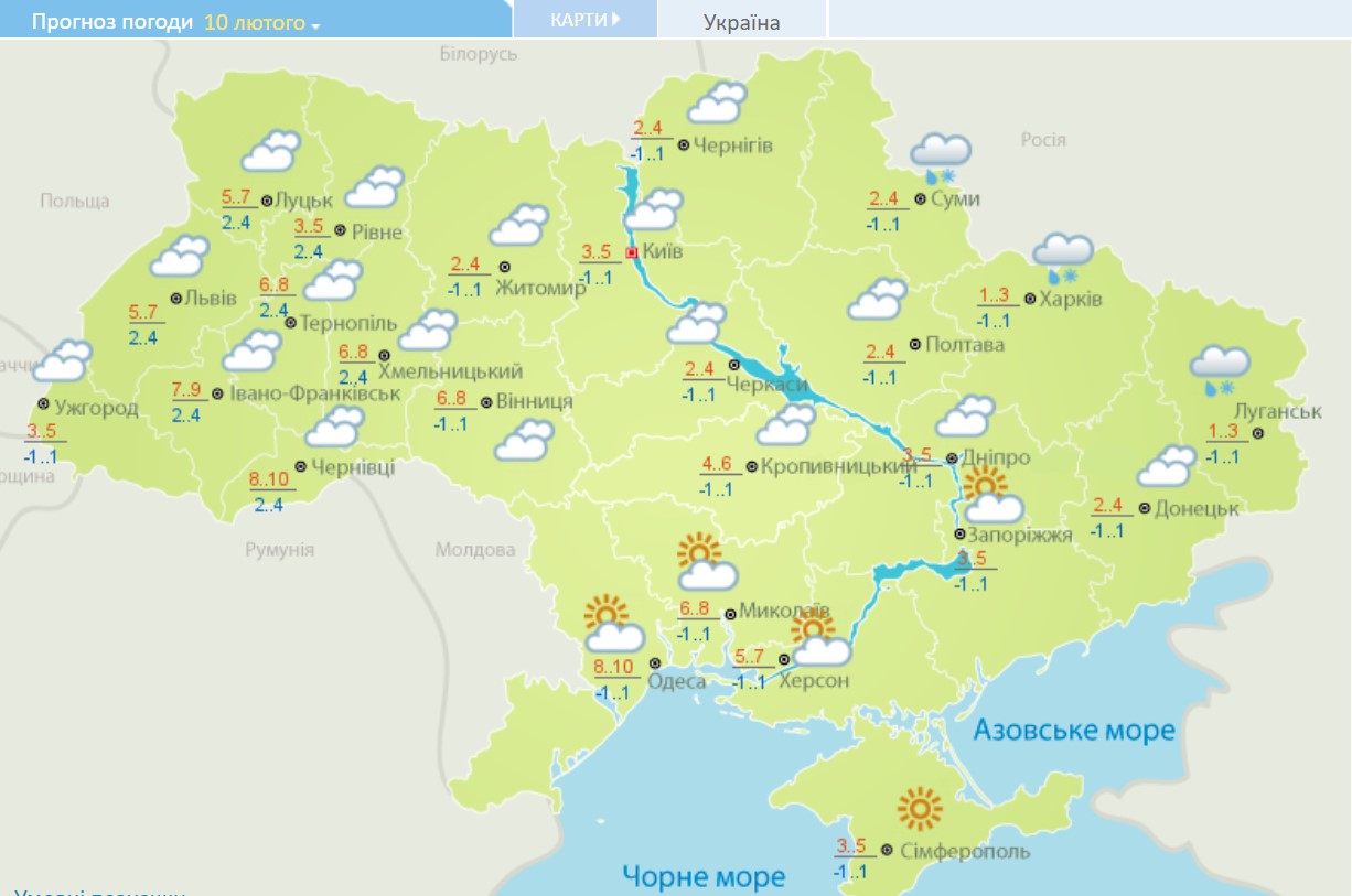 В четверг, 10 февраля, осадки в виде дождя со снегом ожидаются в Луганской, Харьковской и Сумской областях. На остальной территории будет сухо, но облачно.