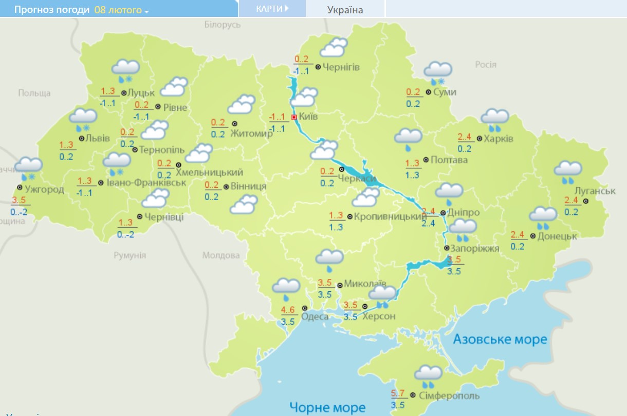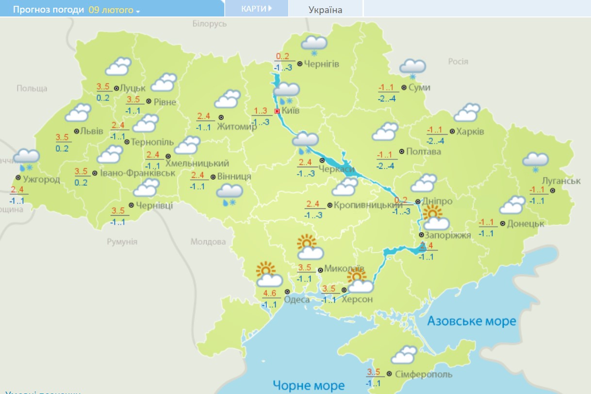 В среду, 9 февраля, мокрый снег ожидается на Закарпатье, а также в Винницкой, Киевской, Черниговской, Сумской и Луганской областях. На остальной территории Украины будет облачно, но сухо.