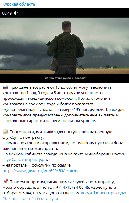 Худшие условия предлагаются в Курской области. Объявление здесь размещено, в частности, на официальном Telegram-канале местной власти. Желающим послужить по контракту предлагается единовременная выплата в 195 тыс. руб. при условии заключения соглашения на 1 год.
