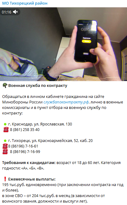 Схожие условия предлагает и администрация Тихорецкого района Краснодарского края – 195 тыс. сразу на руки при заключении контракта на один год и 204 тысячи в месяц в зависимости от звания и выслуги лет в зоне проведения так называемой "СВО".