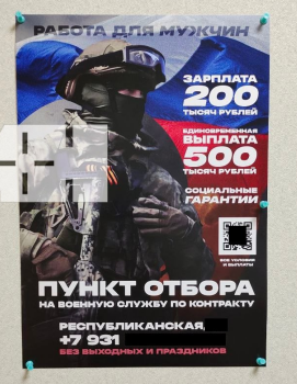 Но происходит и набор добровольцев, о котором говорит Рогозин. Рекрутинг ведется в различных регионах России, причем в самых неожиданных местах. Например, в Петербурге соответствующее объявление было вывешено в поликлинике. Кандидатам предлагают работу "без выходных и праздников" с единовременной выплатой в 500 тысяч рублей и ежемесячным жалованием в 200 тыс. руб.