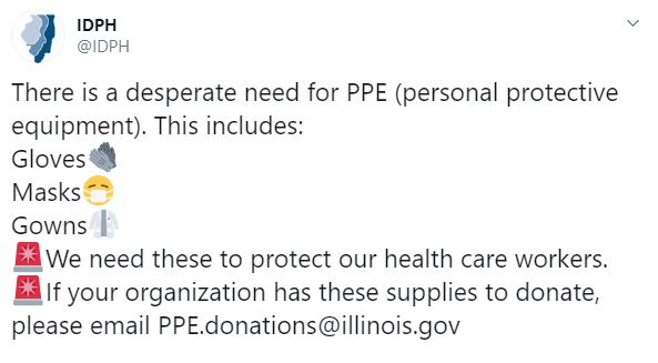 "Существует острая необходимость в средствах индивидуальной защиты. Нам нужны перчатки, медицинские маски, защитные костюмы. СИЗ нужны нам для защиты наших работников. Будем рады любой помощи", - говорится в сообщении на странице Департамента общественного здоровья Иллинойса в Twitter