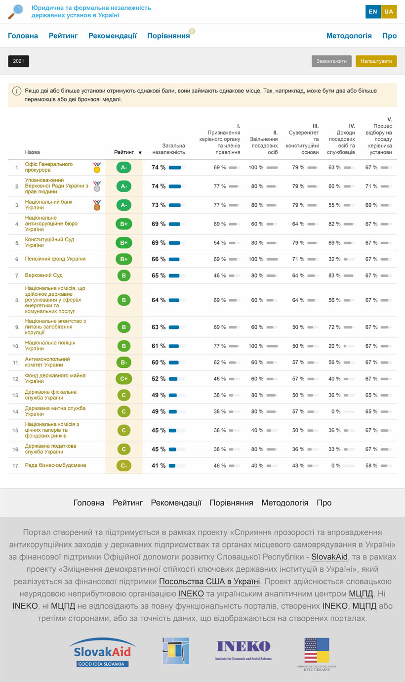 Во вторник, 29 июня, Международный центр перспективных исследований совместно с Институтом экономических и социальных реформ в Словакии (INEKO) при поддержке программы Посольства США в Украине опубликовали рейтинг "Юридическая и формальная независимость государственных учреждений в Украине".