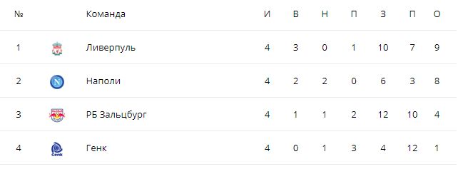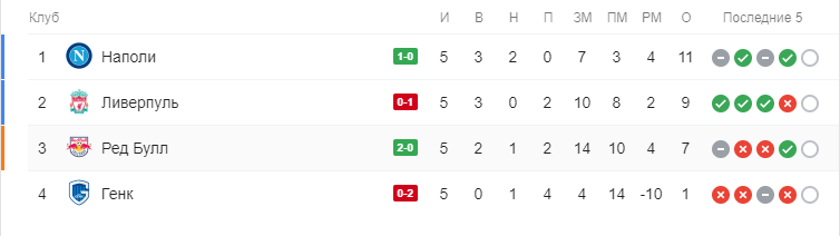 После четырех туров "Ливерпуль" является лидером группы Е, набрав девять очков. "Наполи" занимает второе место, имея в активе восемь очков.