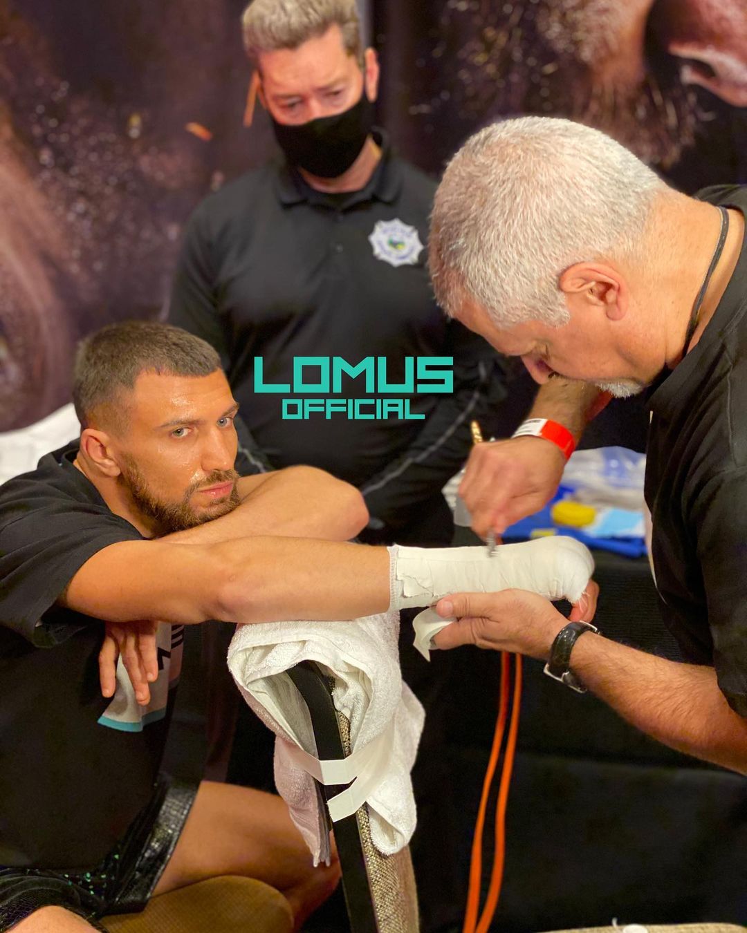 Ломаченко тейпируют руки.