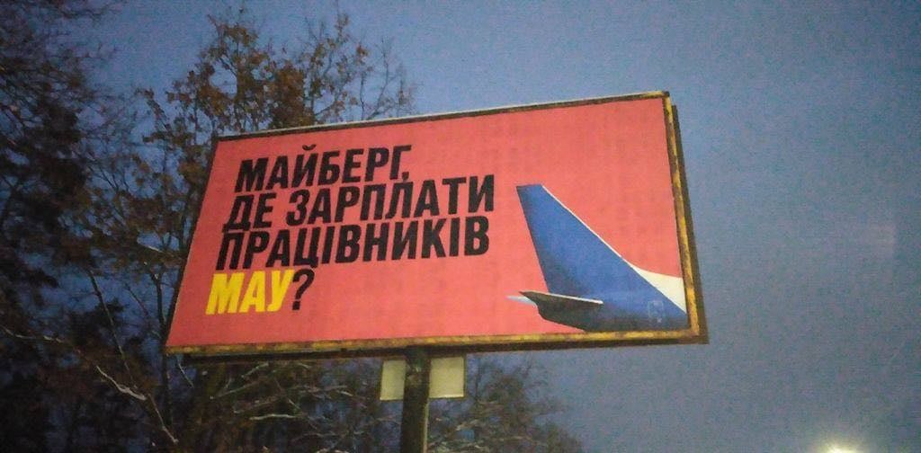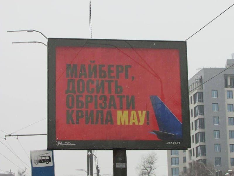 "Майберг, хватит обрезать крылья МАУ", - бигборды такого содержания можно сегодня увидеть в Киеве, а также на трассе, ведущей к международному аэропорту "Борисполь".