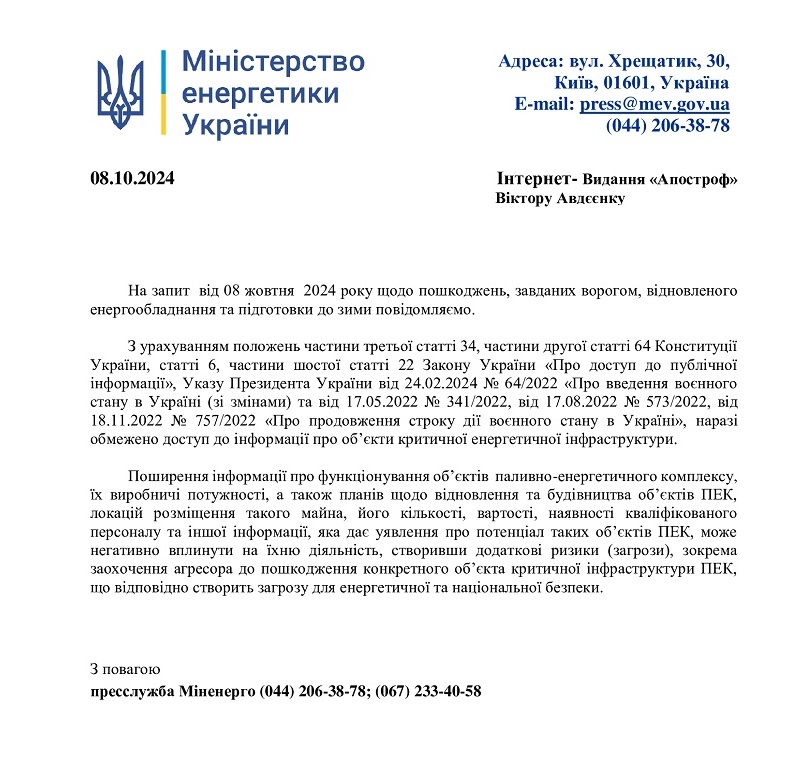 "Распространение информации о функционировании объектов топливно-энергетического комплекса, их производственных мощностях, а также планах по восстановлению и строительству объектов ТЭК, локациях размещения такого имущества, его количества, стоимости, наличия квалифицированного персонала и другой информации, которая дает представление о потенциале таких объектов ТЭК, может негативно повлиять на их деятельность, создав дополнительные риски (угрозы), в частности, поощрение агрессора к повреждению конкретного объекта критической инфраструктуры ТЭК, что соответственно создаст угрозу энергетической и национальной безопасности", - говорится в ответе Министерства энергетики на запрос издания.