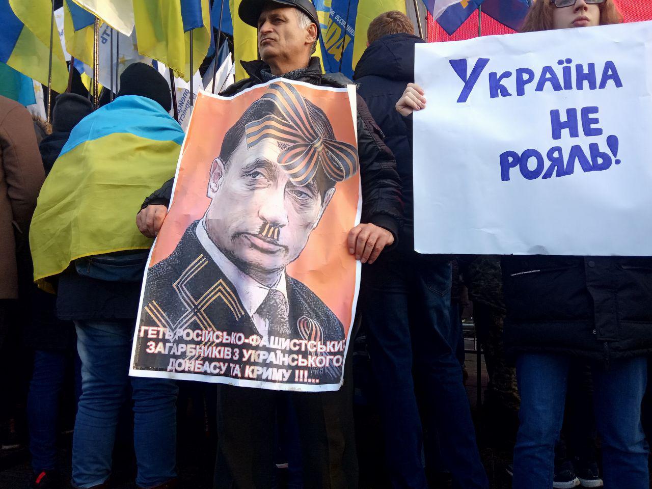 14:15 Митингующие несут с собой плакаты с лозунгами:"Возвращай Крым - это не унитазы","Украина - не рояль", "Путин будет в суде", "Отгороди стеной Банковую, а не Донбасс", "Не ты защищал, не теде сдавать".