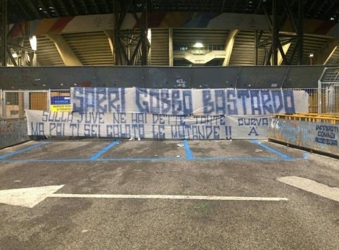 Фанаты "Наполи" вывесили оскорбительный баннер в адрес своего бывшего тренера Маурицио Сарри, который сейчас тренирует "Ювентус". "Сарри – горбатый ублюдок. Ты много говорил о "Ювентусе", а потом снял штаны", – гласит надпись на баннере.
