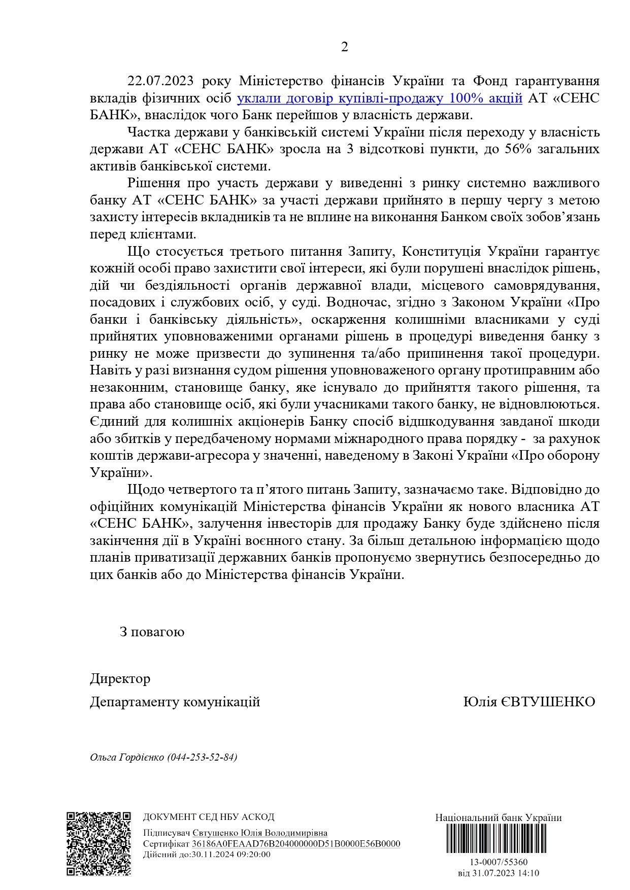 В частности, как переход к госсобственности отразится на клиентах финучреждения – ожидают ли их в связи с этим какие-то проблемы?