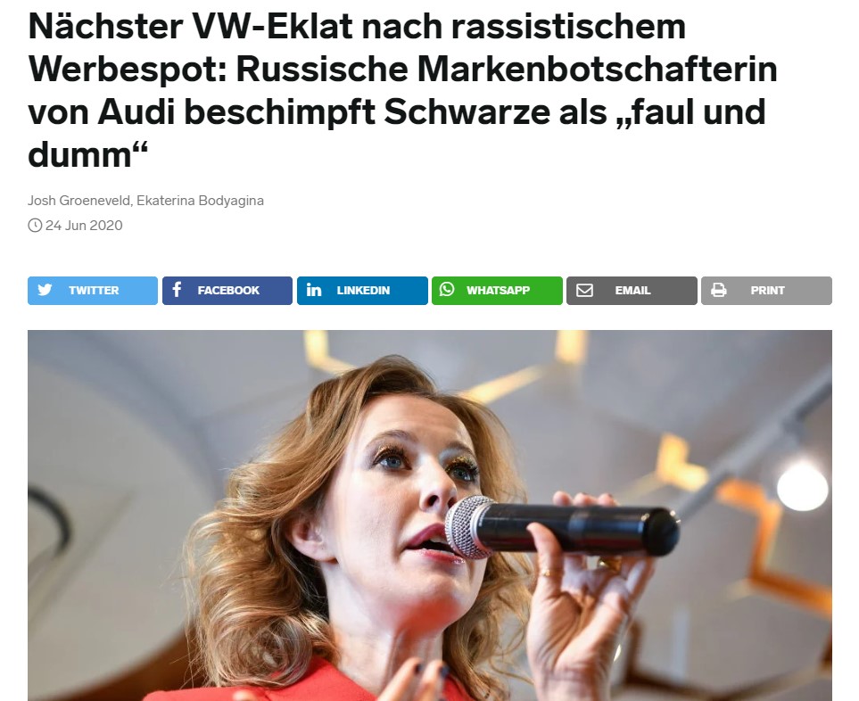 24 июня Business Insider действительно опубликовал статью со следующим заголовком: "Новый скандал с Volkswagen после расистской рекламы: амбассадор российского бренда Audi называет чернокожих "глупыми и ленивыми". Судя по всему, автор материала сослался на высказывания Собчак в Инстаграм, где журналистка недавно высказалась о протестах в США.