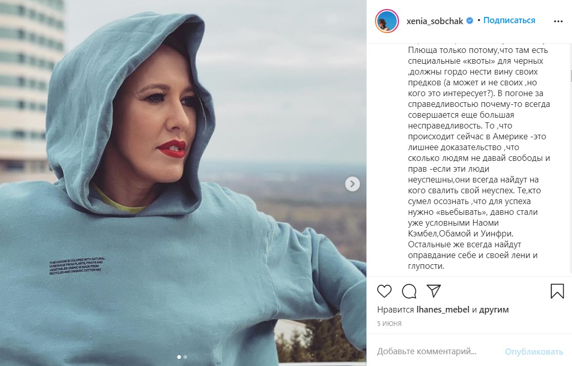 В частности, Собчак сказала следующее: "Те, кто сумел осознать, что для успеха нужно в**бывать, давно стали уже условными Наоми Кэмпбелл, Обамой и Уинфри. Остальные же всегда найдут оправдание себе и своей лени, и глупости".