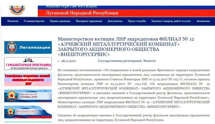 Но такое крупное промышленное предприятие как АМК недолго оставалось бесконтрольным. Как сообщали в конце 2017 года украинские СМИ, Алчевский меткомбинат перешел под контроль компании "Внешторгсервис" Сергея Курченко. Действительно, 28 ноября 2017 так называемое Министерство юстиции так называемой ЛНР сообщило об аккредитации "Филиала №12 "Алчевский металлургический комбинат закрытого акционерного общества "ВНЕШТОРГСЕРВИС".