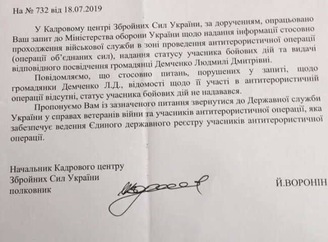 В официальном ответе на запрос, Министерство обороны Украины заявляет, что Людмила Демченко не принимала участие в боевых действиях. Тогда логичный вопрос, откуда у нее справка участника АТО.