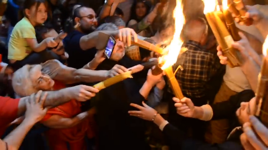 Друзья из Иерусалима заранее позаботились о месте для паломников в храме Гроба Господня – прямо у окошка, где вспыхнет Благодатный огонь. Около трех часов произошло чудо восхождения. Отец Виталий Лопушанский передает свечи с огнем спутникам: Александр Петровский и Эмиль Арутюнян зажигают все три днепровские лампадки. Вместе с ними они отправляются в аэропорт Тель-Авива.