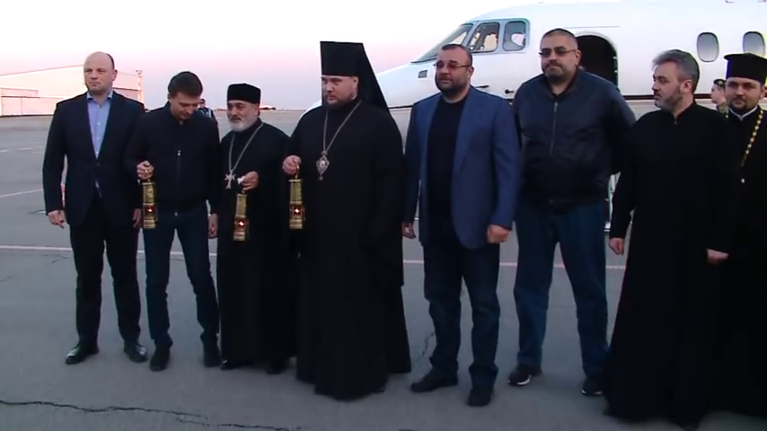 В 19.20 частный самолет мецената приземлился в Днепре. Впервые Благодатный огонь в Украину ранее всех привезли представители Украинской православной церкви Киевского патриархата. После приземления делегация сразу отправляется в храм иконы "Неожиданная Радость". Здесь, на улице Сечевых Стрельцов, многолюдно. Многие люди в военной форме – это ветераны войны с Москвой, в частности – отцы-капелланы. Они собрались взять Благодатный огонь для воинов на востоке Украины.