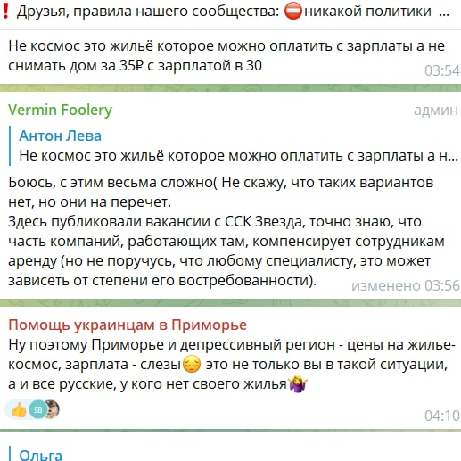 Через этот же телеграм-чат, волонтеры ищут депортированным мариупольцам одежду, продукты питания, лекарства, очки и даже слуховой апарат. Здесь же размещают вакансии. Встречаются объявления и о продаже жилья.