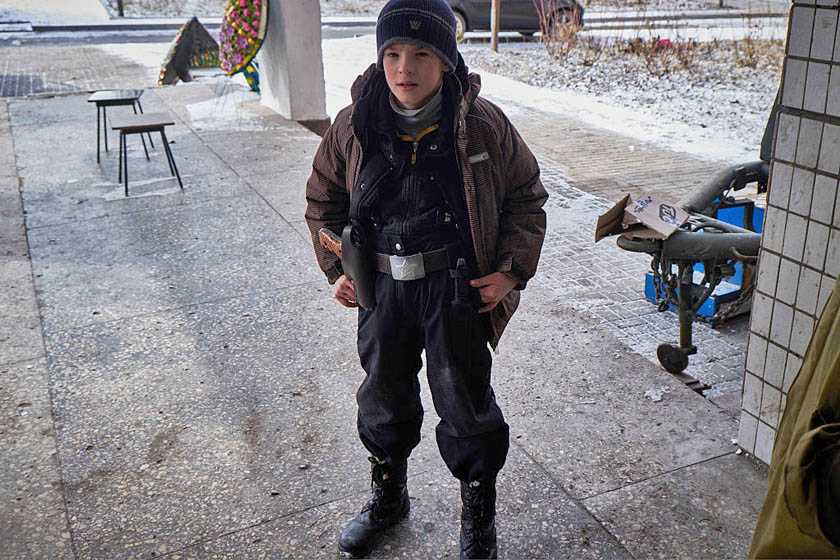 Десятилетний мальчик демонстрирует боевой пистолет и нож, Донецк, 2015 год