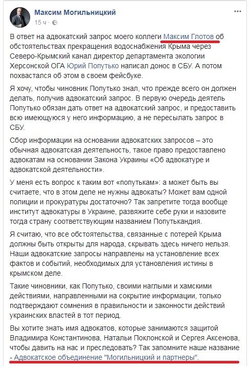 Кроме того, именно Могильницкий требовал от правительства предоставить ему документы по поводу перекрытия Северо-Крымского канала: