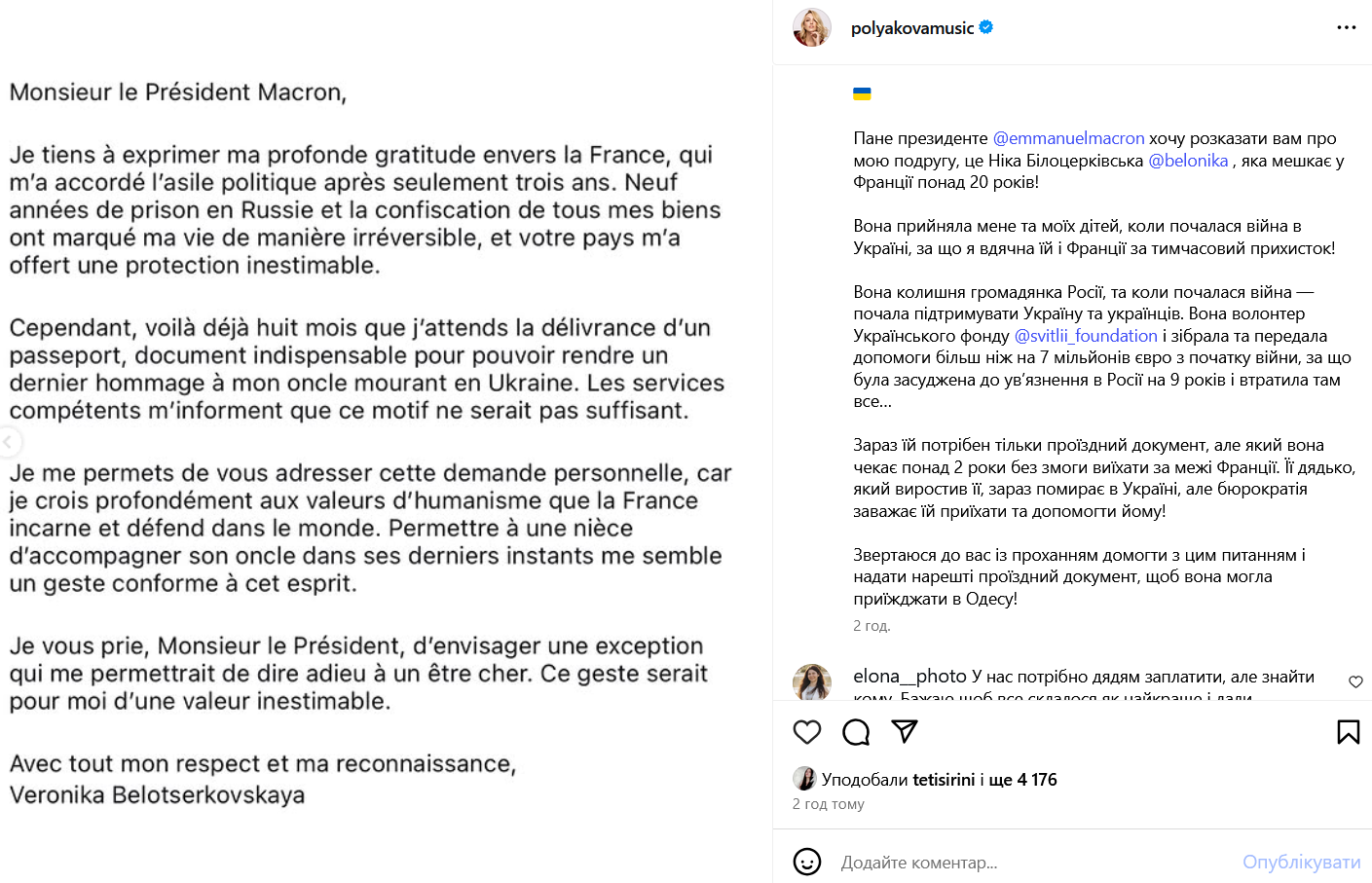 Причиной обращения украинской певицы к президенту Франции стало то, что ее подруга не может выехать из страны из-за отсутствия проездного документа. У Ники в Одессе умирает дядя, но из-за бюрократических преград она не может быть рядом с ним в критический момент. В посте в Instagram Полякова напомнила, что Белоцерковская активно помогает Украине и предоставила ей временное убежище в начале полномасштабного российского вторжения.