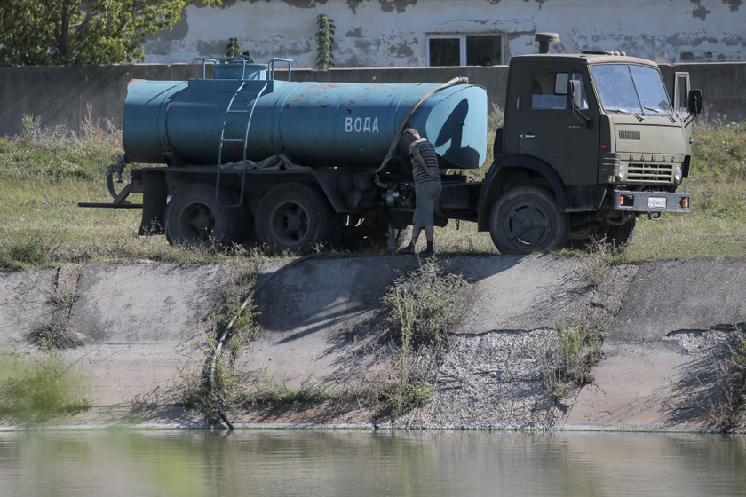 Автоцистерна набирает воду из пруда в селе Константиновка Симферопольского района для обеспечения жилых районов пресной водой