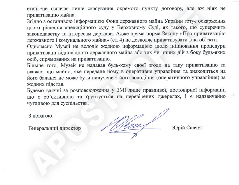 "Имущество, переданное музею в оперативное управление и находящееся у него на балансе, не может быть отчуждено из его оперативного управления ни при каких обстоятельствах", - говорится в ответе музея на запрос "Апострофа".
