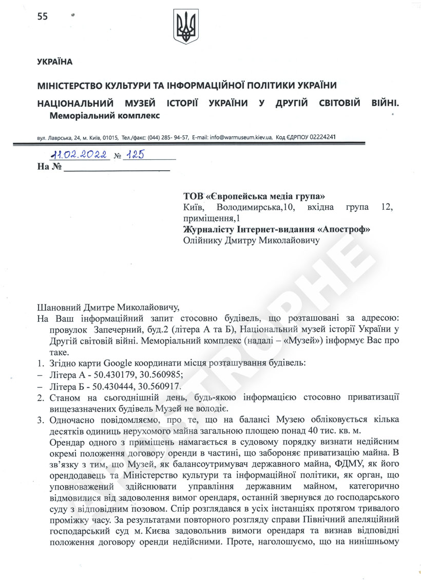5 октября 2015 года компания "Архитектурная мастерская Инка" арендовала у Фонда госимущества два здания на территории мемориального комплекса "Национальный музей истории Украины во Второй мировой войне".