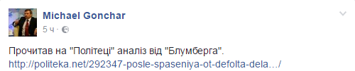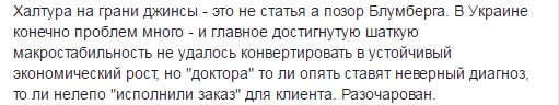 "Халтура на грани джинсы - это не статья а позор "Блумберга". В Украине конечно проблем много, и, главное, достигнутую шаткую макростабильность не удалось конвертировать в устойчивый экономический рост, но "доктора" то ли опять ставят неверный диагноз, то ли нелепо "исполнили заказ" для клиента", - резюмировал эксперт.