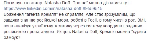 "Впечатления "агента Кремля" не производит. Но становится понятным, что благодаря знанию русского языка, работе в России, в том числе, в российских СМИ, она анализирует украинскую тематику через систему координат, заданных российской пропагандой. Если есть Natasha Doff, Кремлю можно "курить бамбук", - написал Гончар в Facebook.