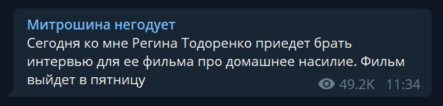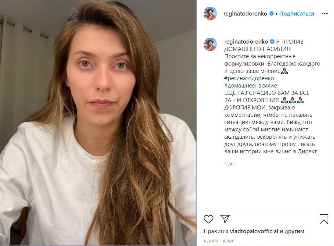 "Сегодня ко мне Регина Тодоренко приедет брать интервью для ее фильма про домашнее насилие. Фильм выйдет в пятницу", - написала блогер.