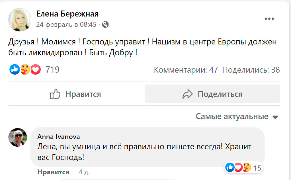 А непосредственно в день российского вторжения, 24 февраля 2022 года, мать экс-народного депутата Украины Ирины Бережной - Елена Бережная в фейсбуке приветствовала начало бомбардировок Украины и мирных городов.