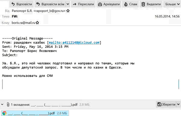 В нем говорится о взломанном почтовом ящике Бориса Рапопорта, заместителя начальника управления пограничного сотрудничества Администрации президента РФ, которое лично курировал Владислав Сурков. Публикация касалась таинственного отправителя многочисленных электронных писем в адрес Рапопорта под именем "рашидович казбек". Впоследствии выяснилось, что этот псевдоним принадлежит экс-замглавы Администрации президента Украины Андрею Портнову, который был правой рукой Виктора Януковича по вопросам судебной системы Украины.