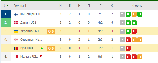В турнирной таблице 8-й группы отбора Евро-2021 U21 молодежная сборная Украины занимает 2-е место, имея в активе 3 очка после 2 матчей. Румыны располагаются на последней, 6-й, позиции, не набрав пока ни одного очка.