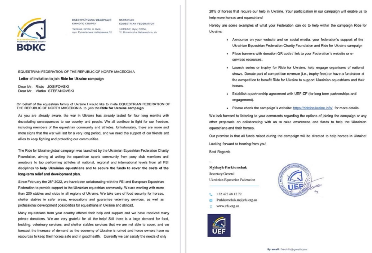 Фото - Письмо Всеукраинской федерации конного спорта Украины в федерацию конного спорта Северной Македонии о предоставлении финансовой помощи