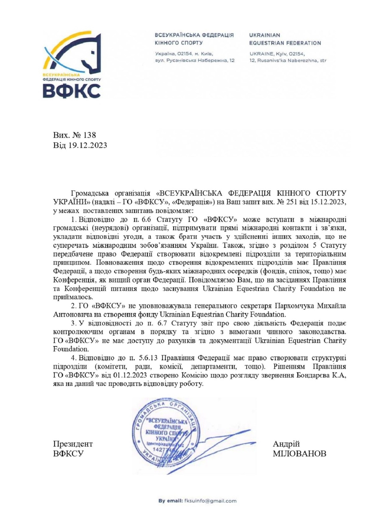 Наша общественная организация обратилась с официальным запросом в ВФКСУ по поводу того, имеет ли федерация отношение к бельгийскому фонду. В ответе нам отметили, что ВФКСУ не уполномочивала генерального секретаря Пархомчука Михаила на создание фонда "Ukrainian Equestrian Charity Foundation". Соответственно, не имеет доступа к счетам и документации этого фонда, поэтому данный фонд юридически никак не связан с ВФКСУ.