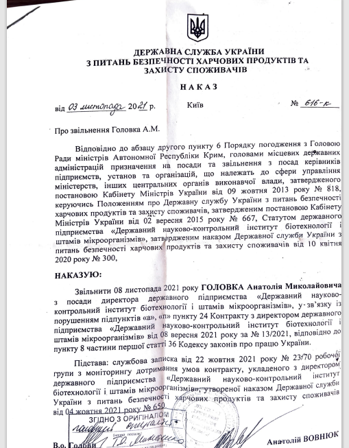 Госинститут, о котором идет речь, – это фактически единственное учреждение ветеринарной биотехнологии в Украине, где занимаются разработкой, экспертизой, регистрацией и контролем качества иммунобиологических препаратов. Учреждением с приличным государственным финансированием много лет руководил Анатолий Головко. В ноябре 2021 года г-на Головко после внутреннего аудита, который проводила специальная рабочая группа, уволили с должности директора приказом тогдашнего председателя Госпродпотребслужбы Украины Анатолия Вовнюка. Основанием для увольнения явилось, как указано в документе, "нарушение подпунктов "а", "п" пункта 24 Контракта с директором государственного предприятия".