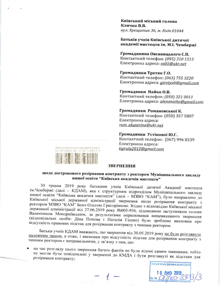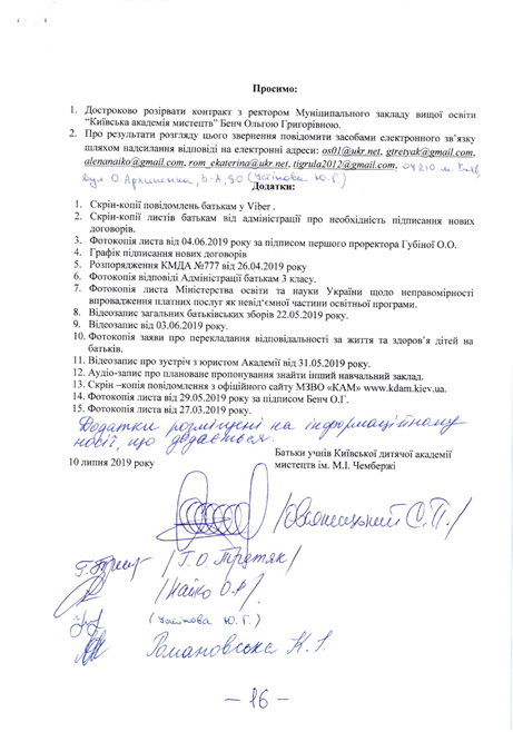 О самых активных участниках кампании против нового руководства Академии и ее ректора можно узнать из следующего письма, в котором указанные в нем родители просят мэра Киева досрочно расторгнуть договор с Ольгой Бенч.