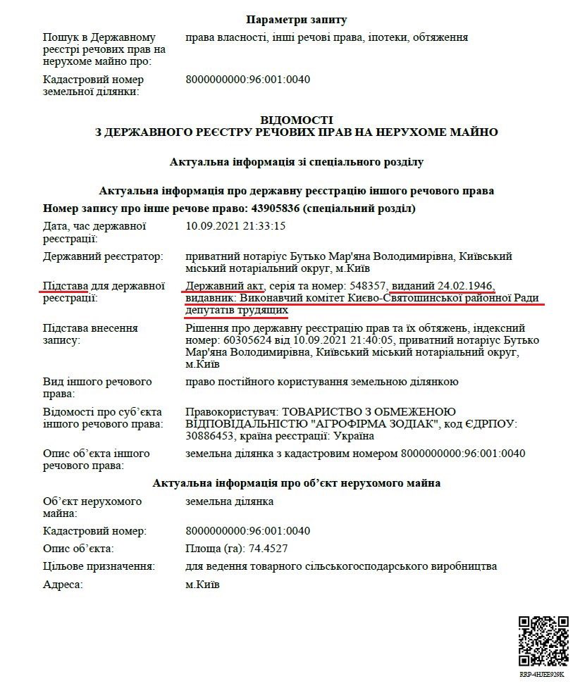 для принятия отмененного решения государственного регистратора служил государственный акт на вечное пользование землей колхозами от 24.02.46 № 548357, изданный Исполнительным комитетом Киево-Святошинского районного совета депутатов трудящихся о том, что по сельскохозяйственной артели им. Ворошилова закрепляется в бесплатное и бессрочное пользование, то есть навечно, земля в количестве 1217,3 га, а также сведения из Государственного земельного кадастра от 10.09.2021 N 49423999, полученные в результате взаимодействия, в которых указано, что владельцем (пользователем) земельного участка Исполнительный комитет Киево-Святошинского районного совета депутатов трудящихся, а также документ, удостоверяющий это право, является вышеуказанный государственный акт.