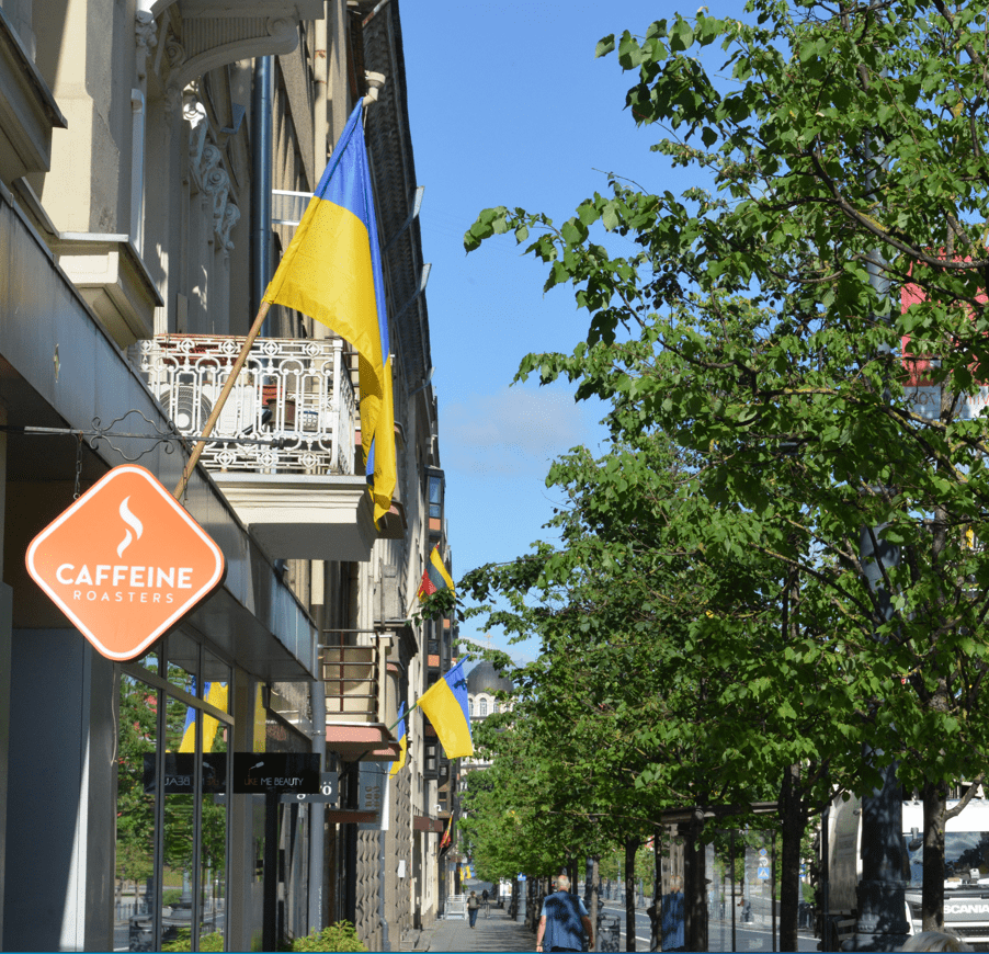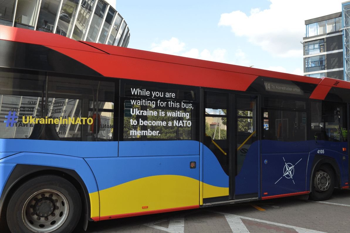 Автобус, который встречает тебя в аэропорту Вильнюса, чтобы довезти в центр литовской столицы, мелькает красным "Vilnius (далее символ сердечка) Ukraine". На кабине водителя флаги НАТО и Литвы. В самом городе украинских флагов больше, чем натовских или литовских – на улице, на балконах и окнах. На крыше торгового центра Nordika, недалеко от аэропорта, размещен огромный украинский флаг. Этот флаг шириной в 10 м. и длиной в 15 м. будет самым большим во время акции "Поднимаю флаг за Украину в НАТО", организуемой Blue/Yellow и Peremoga. Жителей Вильнюса призывают во время этой акции поднять 33 тысячи украинских флагов, чтобы поддержать стремление нашей страны стать 33-м членом Альянса. Полученный на фронте украинский флаг сейчас бегуны несут из Киева в Вильнюс. Его поднимут на Лукишской площади 11 июля.