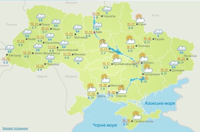 Днем на западе от 16 (северозапад) до 19 (югозапад) градусов тепла. В северных и центральных областях будет +16+19, на востоке и юге ожидается +19+22, а в Одесской области будет +21+23.
