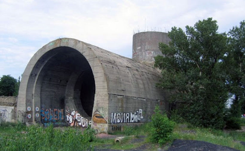 Бункер странной формы с удивительной акустикой находится возле парка "Наталка" на Оболонской набережной. Конструкция, напоминающая огромную подводную лодку - это кессон заброшенного и недостроенного сталинского метро, который должен был стать секретным объектом, альтернативой наземному транспорту и объединить под землей (то бишь под водой) два берега Днепра. Его строили на случай войны, но война и прекратила это строительство. А уже после ее завершения в достройке не было необходимости.